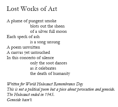 A few years ago I wrote a poem to commemorate Holocaust Remembrance Day. The poem has the title Lost Works of Art and I decided to include it in my book. I wanted to highlight the waste of human life and how such a waste should never be accepted.